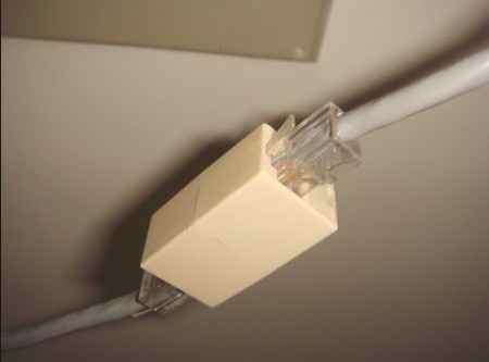 故障现象:单位办公室没有安装网络模块,网线从机房引出后直接插接在网卡上。现在办公室的电脑桌因故需要移动几米,而网线长度不够长。请问有什么方法能够解决网线不够长的问题呢,直接剪断网线进行连接行不行?解决方法:将网线的水晶头剪断再接出一段网线的做法显然是不行的,因为这样做会破坏网线的电气特性,使数据传输的误码率大大增加。建议购买一个两头均是RJ-45接口的RJ-45连接器,然后再做一根足够长的网线进行连接即可,如图: