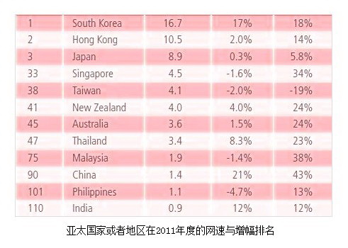 据Record Japan新闻网2月1日消息,根据全球最大的CDN服务商美国Akamai公司1月31日公布的最新数据显示,2011年第四季度世界平均网速同比提升了39%,达2.7Mbps,平均连接速度最快的国家或地区是韩国,日本排在第三位。而中国大陆仅排在第90名。 数据显示,2011年第四季度韩国平均网速同比增加18%,达16.7 Mbps,中国香港以10.5 Mbps(同增14%)位居第二;日本则以8.9 Mbps(同增5.8%)排在第三位;美国同比增幅达到了23%,以6.1 Mbps位列第13名。中国大陆以1.4Mbps的网速排在第90名,不过其网速同比增幅达到了43%。 此外,2011年度全球网速峰值最高的国家或地区仍为韩国,达46.8 Mbps,其次分别是中国香港46.0 Mbps、罗马尼亚34.5 Mbps以及日本32.9 Mbps。而在“网速低于256Kbps的慢速互联网用户比例”的比较中,印度以29%高居亚太地区第一名。中国大陆与新西兰并列第二,但这两个地区的慢速互联网用户比例仅为3.3%。
